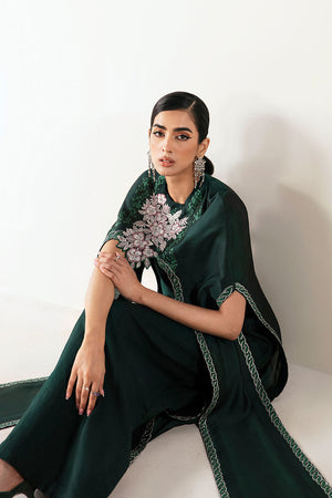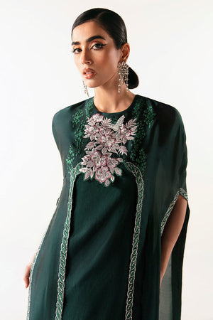 In a ravishing shade of green this ensemble is a sight to behold. It features a jacket adorned with intricate embroidery that gracefully encircles the entire border. The epitome of sophistication, this ensemble is paired with a draped dress, exuding an air of enticement.The shipping charges for all articles barring Bridals are as follows: