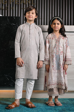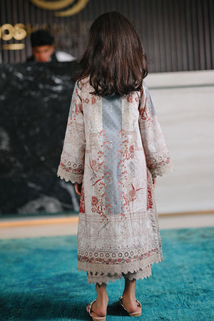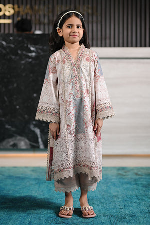 A stunning printed long shirt in a timeless beige and brown palette, elevated with embroidered organza lace borders and intricate lace detailing. The graceful bell sleeves add a touch of drama, while the ensemble is completed with a beautifully tailored izaar.