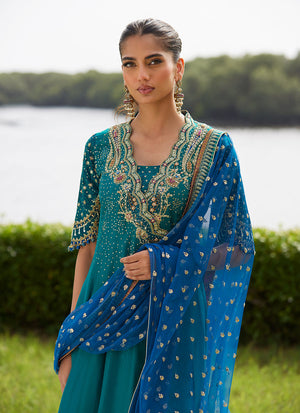 The ensemble is completed with a deep teal tulle dupatta, adorned with scattered sequins and trimmed with an opulent zari border