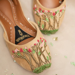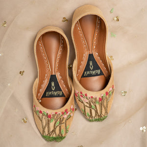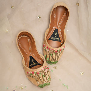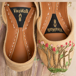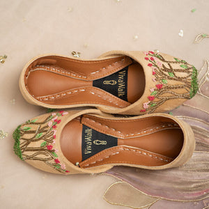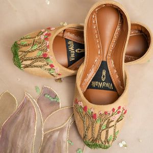 Step into a realm of enchantment with our “Enchanted Grove” Khussa! Meticulously crafted, this stunning footwear showcases a mesmerizing blend of multi-colored Resham work, intricate Dabka, and delicate French knots. The luxurious velvet upper and durable leather sole ensure both style and comfort with every step. Whether jazzing up for a celebration or spicing up your daily attire, slip into our “Enchanted Grove” Khussas for an instant style boost. Let your feet be the canvas for elegance and charm—grab your pair now and step into a world of enchantment! Inner lining– leather texture for comfort