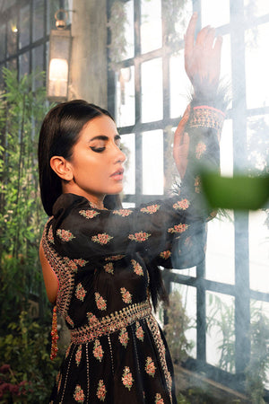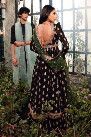 A heavy embroidered raw silk black front open peshwas paired with farshi sharara and completed with mehndi green sequenced dupatta.front open kalidaar length: