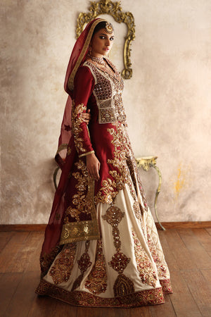Mughal majesty meets modern luxury: Exquisite bridal outfit crafted from pure printed silk, intricately enhanced with Nakshi, Dabka, and Zardozi embroidery, perfect for the discerning bride.