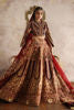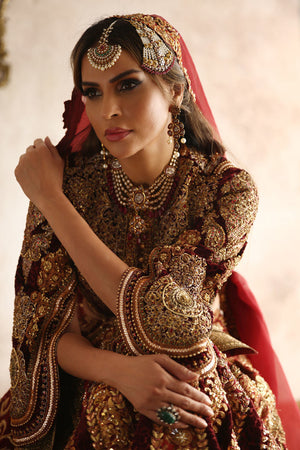 Timeless bridal beauty: Exquisite heavy pure printed silk outfit inspired by Mughal artistry, showcasing a stunning palachi texture, intricately adorned with Nakshi, Dabka, and Zardozi work, creating a truly regal bridal look.