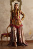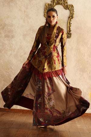 Ottoman-inspired jacket with bellbottom and inner, printed on pure silk, showcasing stunning embroidered floral bunches and hand-touching details, celebrating the beauty of heritage fashion.