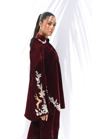 Rendered in deep burgundy velvet, this cape kurta is a study in modern regality. The flowing silhouette features slit sleeves adorned with pastel resham florals, appliqué details, and metallic zardoze accents that shimmer softly against the plush base. Paired with a matching velvet balloon shalwar, the ensemble is an ode to contemporary femininity.