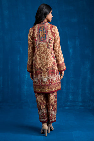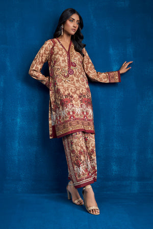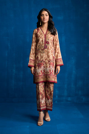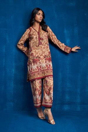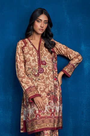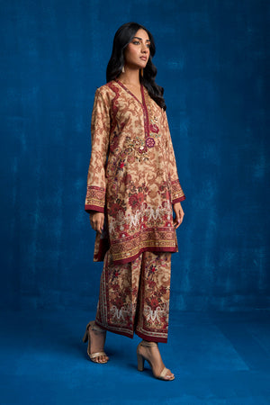 Experience the elegance of ethnic wear with this exquisite ensemble crafted from Khaadi silk fabric. The set includes a printed straight shirt and matching straight pants, adorned with an ethnic print that showcases intricate traditional patterns and rich colors, reflecting the heritage of our culture. Floral resham thread embroidered motif enhanced with zardozi work appliqued on the neckline patti.