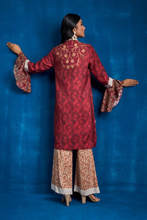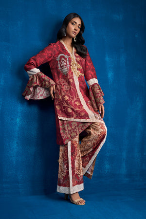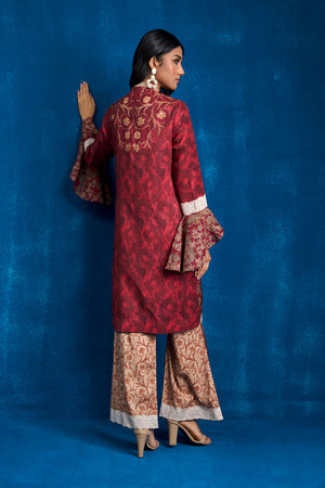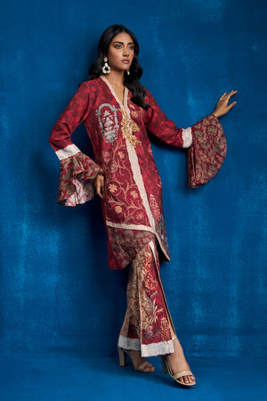 Elevate your ethnic wardrobe with this luxurious two-piece outfit made from Khaadi silk fabric. The ensemble features a printed shirt and stylish slit pants, inspired by the grandeur of Baroque ornaments, combining traditional elegance with a modern silhouette. The neckline is adorned with Tila embroidered floral motif, meticulously enhanced with Zardozi work appliqued on the neckline, adding a regal touch to the outfit.