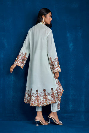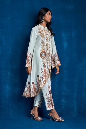 Step into elegance with this stunning two-piece outfit, crafted from Khaadi silk fabric. The ensemble features a long A-line shirt with round scalloped daman paired with straight pants, adorned with a sophisticated Baroque-inspired print that exudes timeless charm and opulence.