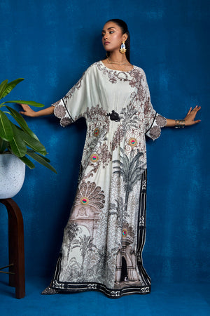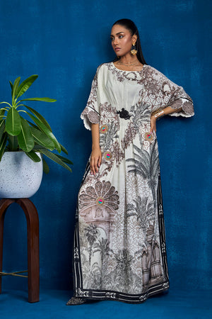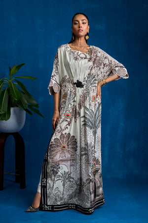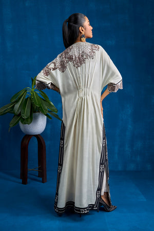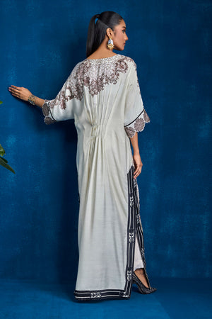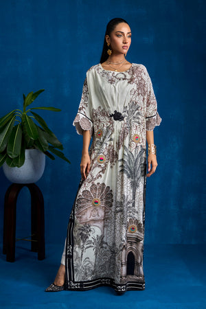 This elongated kaftan in summer khaddi silk fabric,showcase a neutral-themed all-over print. Its pleated design is enhanced with embroidered motifs in an accent palette, adding versatility to the look. Finished with embroidered borders all round ,this silhouette makes a cool, breezy essential for any summer wardrobe.