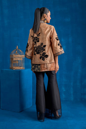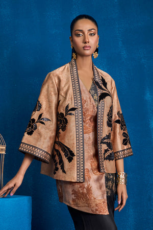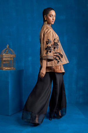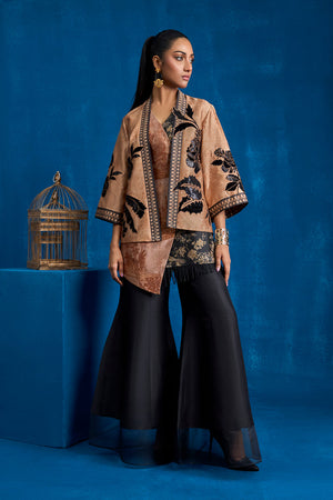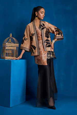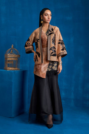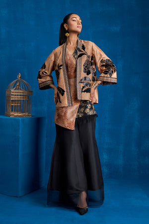Immerse yourself in the epitome of contemporary elegance with this striking outfit. Featuring a short printed jacket and inner on sheesha silk fabric, this ensemble masterfully blends intricate design elements creating a look that is both timeless and modern. Black velvet and sequin fabric is appliqued on the floral motifs on the front, back and sleeves of the jacket. Overlap printed inner created with black floral and coffee self on self-architectural inspired print on sheesha silk. Black print is finised with black fringes.