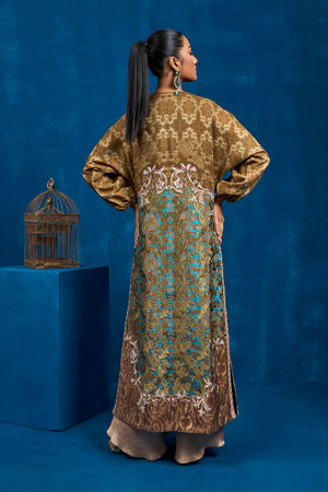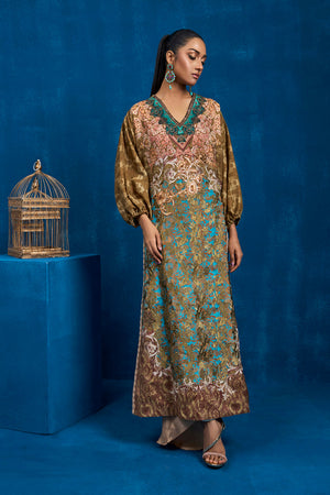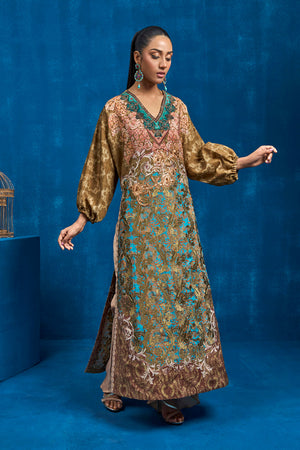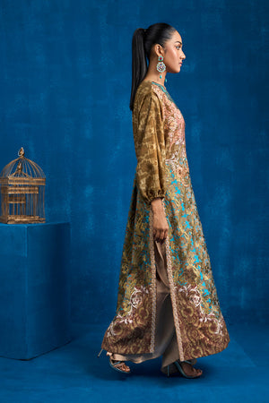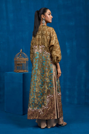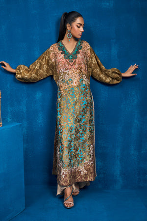 A long tunic adorned with both embroidered and printed details crafts a perfect silhouette for festive occasions. The accentuated print on the neckline harmonizes beautifully with the embroidered jaal on the front and back, complemented by long slits.Puffed sleeves provide additional intricacy to this versatile look. Paired with elegant coffee pants, it adds an essence of class and sophistication, completing the ensemble.