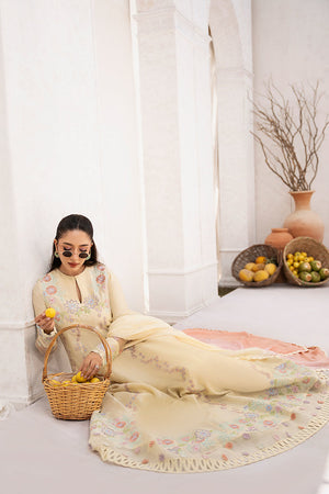 Light yellow khadi silk kalidar, featuring floral embroidery and kali details for added depth and movement. The fabric is adorned with 3D floral motifs, while organza and lace detailing add intricate touches to the overall design. The medium silk dupatta is detailed with floral bootis and pallu embroidery, tying the ensemble together with soft, delicate accents. The pants are made from staple cotton, offering comfort while complementing the floral theme.