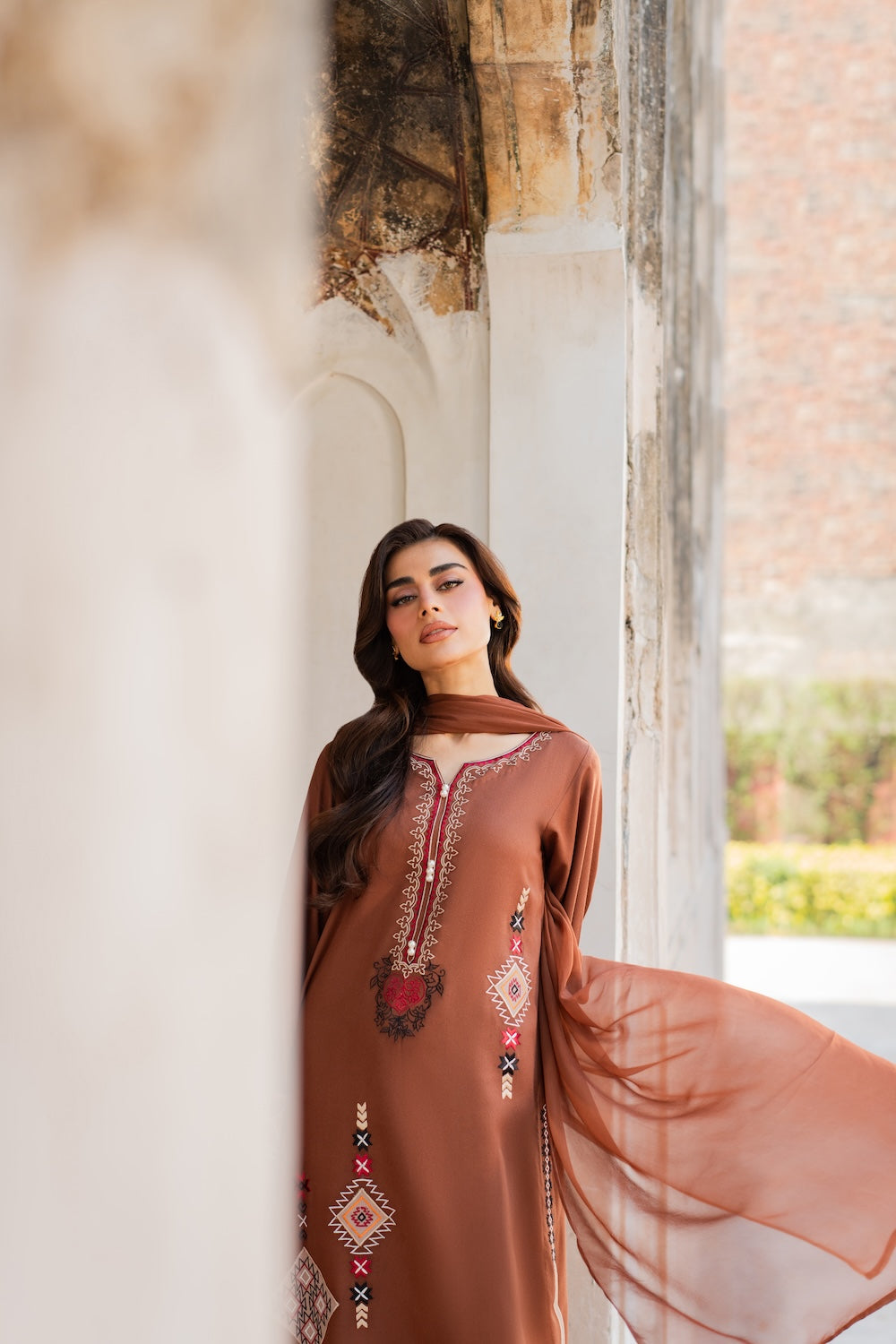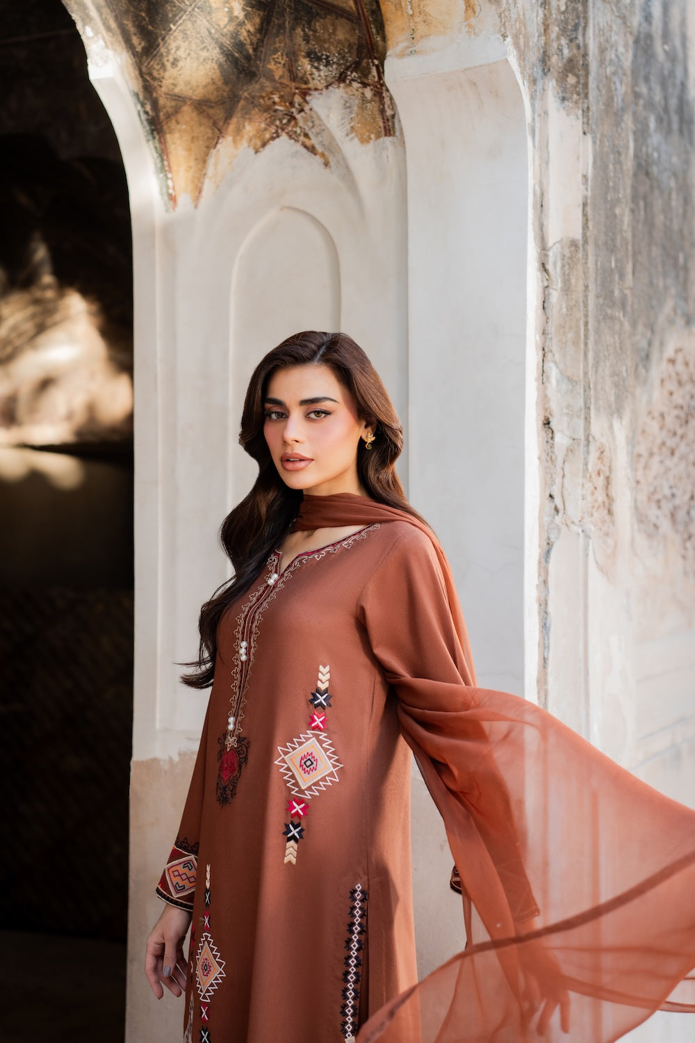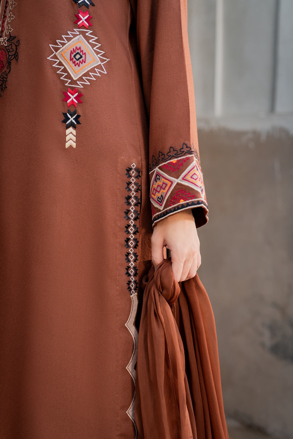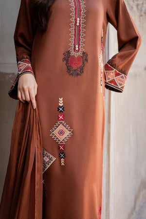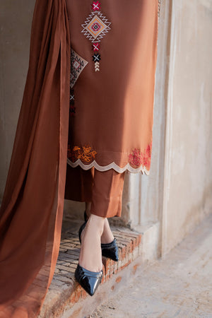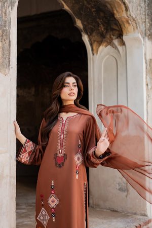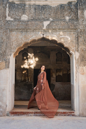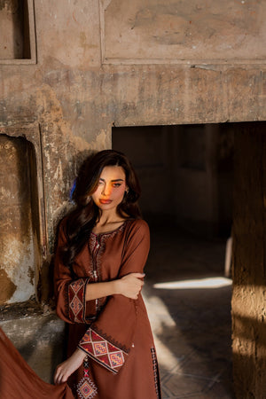 A dreamy confection of karandi, rendered on a burnt orange base embellished with mesmerizing embroidery in monotones resham thread on a geometric setting. Accompanied with perfectly tailored pants with immaculate stitching details and intricate floral embroidery on the overall shirt and sleeves, this statuesque design ideal for your all festive season.