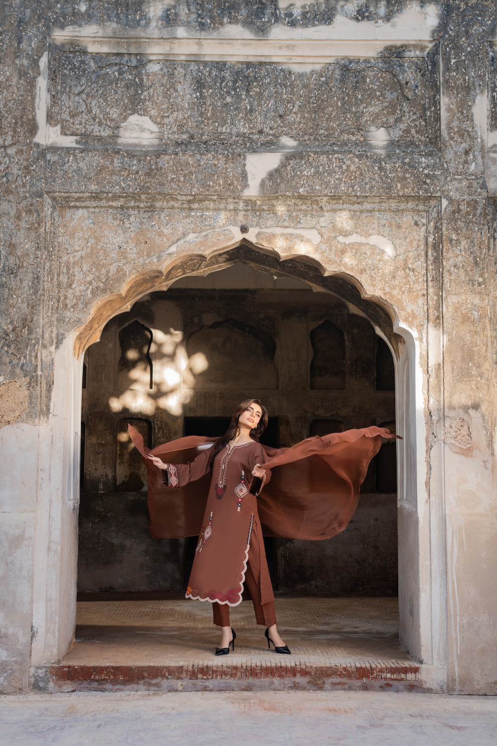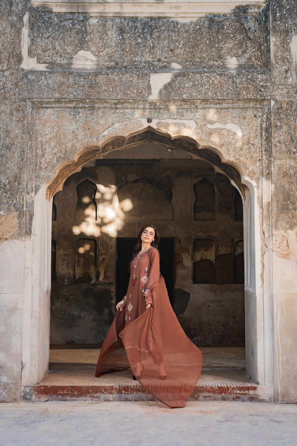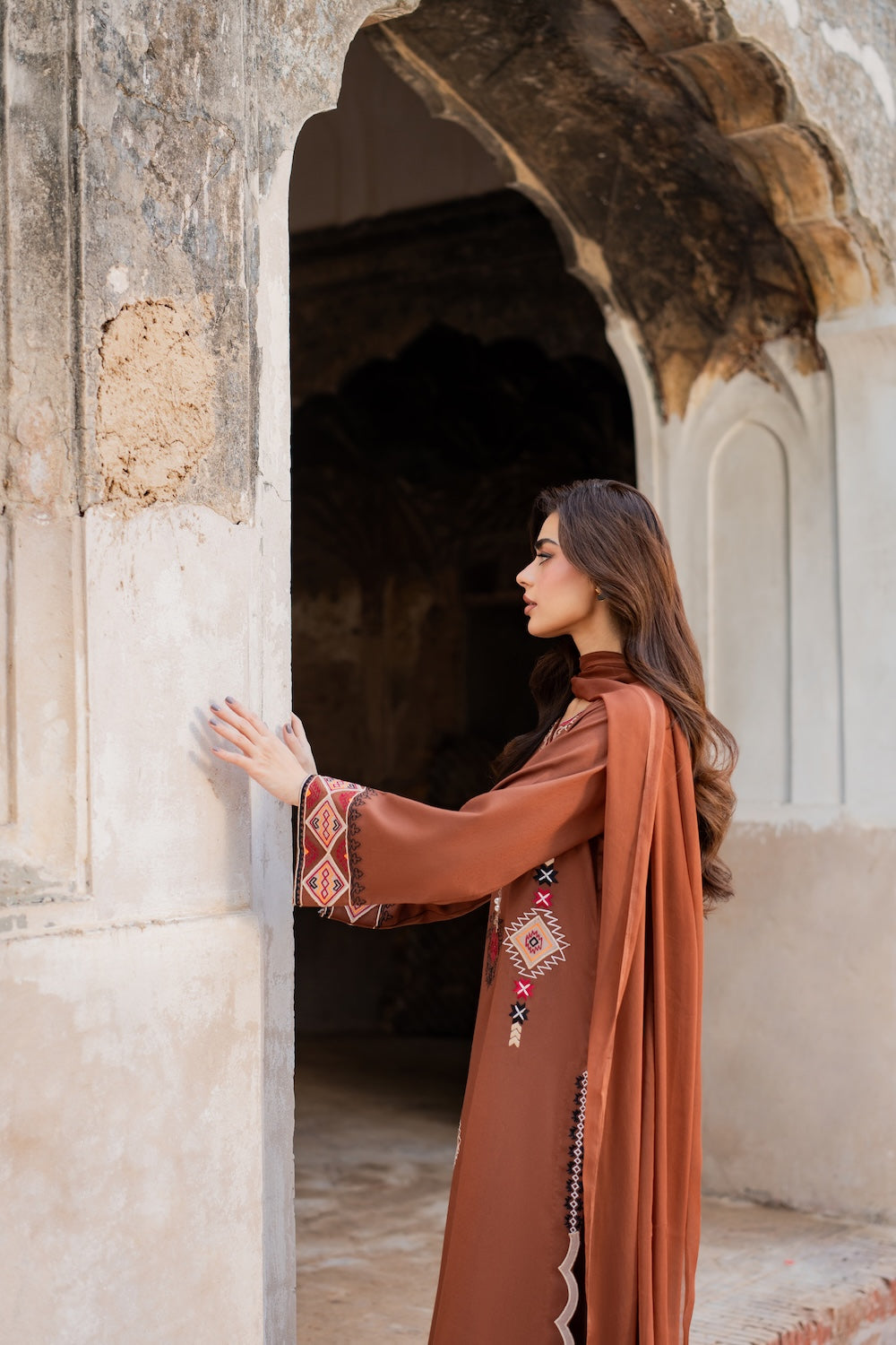 A dreamy confection of karandi, rendered on a burnt orange base embellished with mesmerizing embroidery in monotones resham thread on a geometric setting. Accompanied with perfectly tailored pants with immaculate stitching details and intricate floral embroidery on the overall shirt and sleeves, this statuesque design ideal for your all festive season.