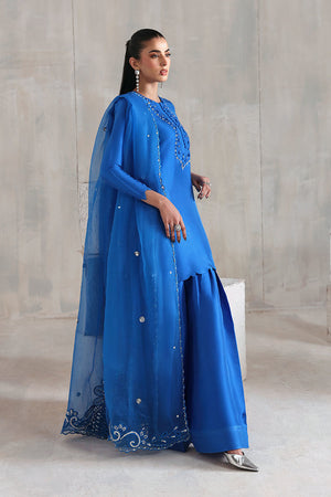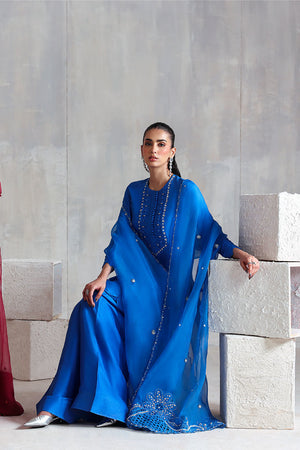 This blue short shirt, crafted from pure raw silk, offers a refined and elegant look. Paired with matching raw silk pants and a pure organza dupatta, the combination exudes grace and timeless appeal, making it a perfect choice for sophisticated occasions.