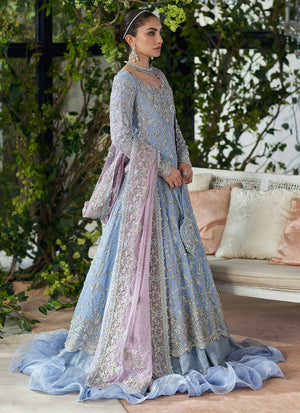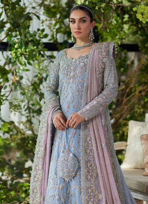 A contrasting light mauve pure net dupatta completes the ensemble, featuring blue edging and exquisitely detailed Art Nouveau-inspired borders. Intricate 3D organza flowers and heavy chan booti work all over add a touch of romance and sophistication to this breathtaking bridal look.