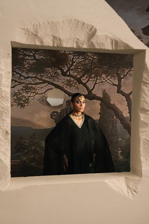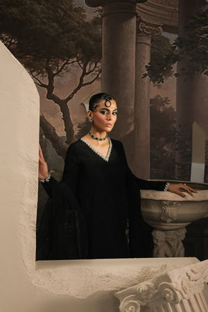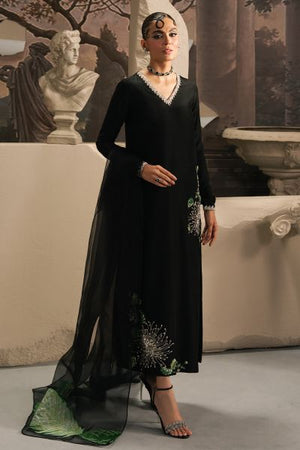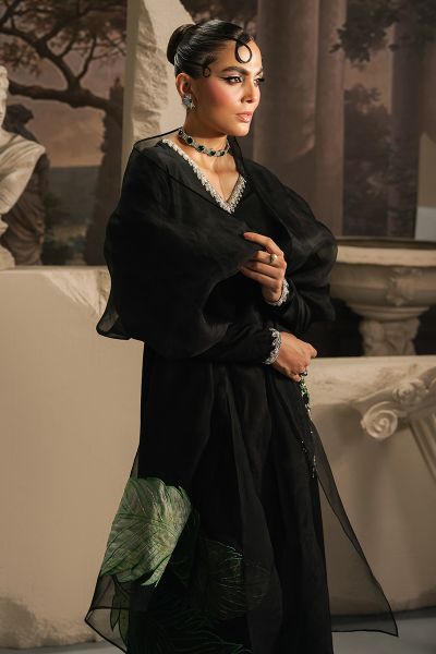 Blending chic sophistication with contemporary charm, Esra is a true ode to modern minimalism. The pure black raw silk shirt is brought to life with intricately composed floral motifs, enriched by craftsmanship through sequins, crystals, and pearls. Paired with sleek pure raw silk cigarette pants, the look is elevated by its organza dupatta the statement piece of the outfit adorned with exquisitely embellished 3D leaves that exude ethereal elegance.