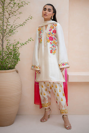 An ivory raw silk short box kurta and shalwar, adorned with meticulous embroidery and delicate handwork, create a harmonious blend of grace. The 'hota' detailing on the shirt adds a touch of intricate charm. The shalwar features intricate block print detailing. The dip-dyed dupatta, sprinkled with sequins, unveils a mesmerizing color breakdown.