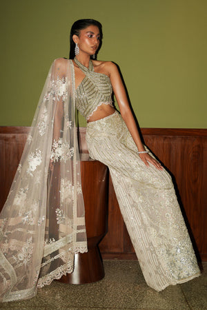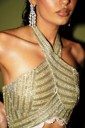 Gaze upon the ethereal splendor of 'Étoile', a vision in powder pink. The blouse, adorned with intricate embellishments, cradles the neckline with a halter design that exudes timeless allure, while the pencil skirt below, touched by whimsy, contours every curve with grace and femininity. The cape steals the spotlight—a flowing masterpiece embroidered with florals, casting an aura of romance and intrigue, each movement spinning tales of enchantment in the moonlight. This ensemble transcends mere attire; it's a symphony of elegance and fantasy fit for the grandest occasions, inviting the wearer into a realm where every moment is poetry.