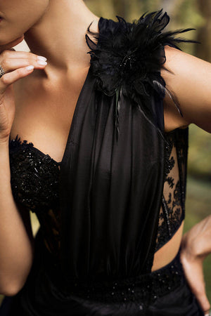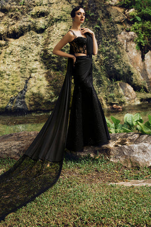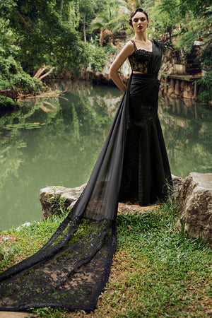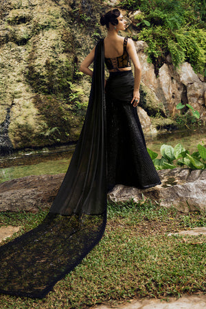 An enchanting black drape skirt crafted from luxurious net fabric, adorned with exquisite sequin detailing throughout. The design features elegant draping that gracefully wraps around the waist and extends up to the shoulder, accented with a stunning embellished motif to evoke a sense of dramatic allure. Paired with a pure Chantilly lace corset, intricately embellished with Swarovski crystals, delicate beadwork, and shimmering accents, this ensemble is a true masterpiece. Seamlessly blending traditional silhouettes with contemporary design, it is the perfect choice for a graceful and unforgettable statement.