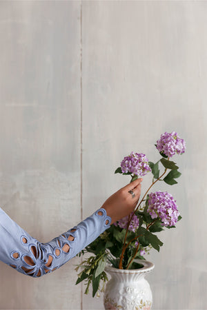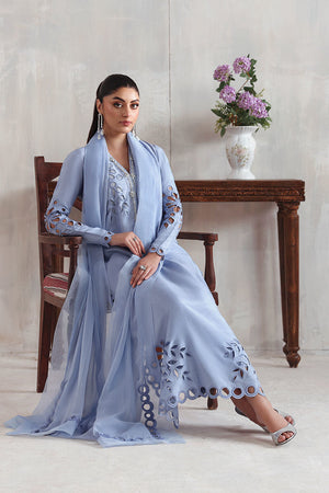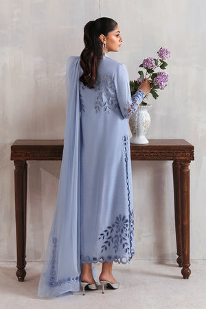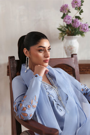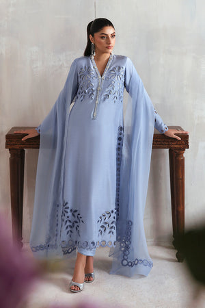 This blue long shirt, made from luxurious Korean raw silk, offers a timeless and elegant silhouette. Paired with matching raw silk pants and a delicate chiffon dupatta, the ensemble radiates sophistication, perfect for a chic and graceful look.