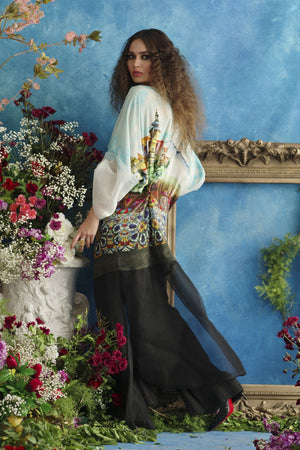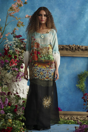 Pure digitally printed crepe silk inspired by landscape scenery/flowers, extended below hip and after print with pure black organza to floor length, sleeves extended after elbow in ivory organza. Three gold medallions motifs worked in gold sequence, beads and pearls placed assymetrically, gold tilla outlines on printed flowers on front.Color: Blue