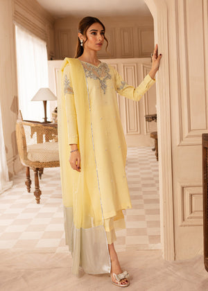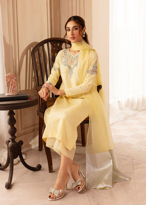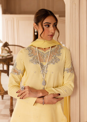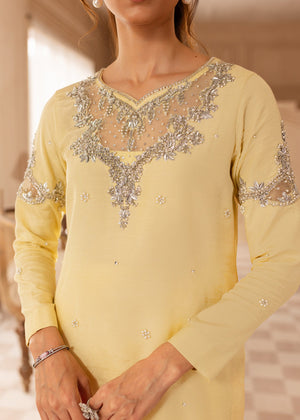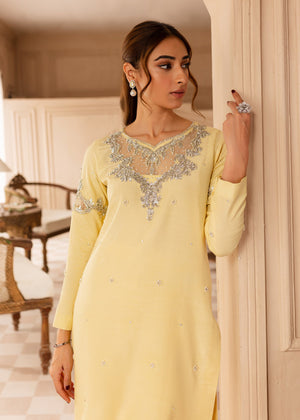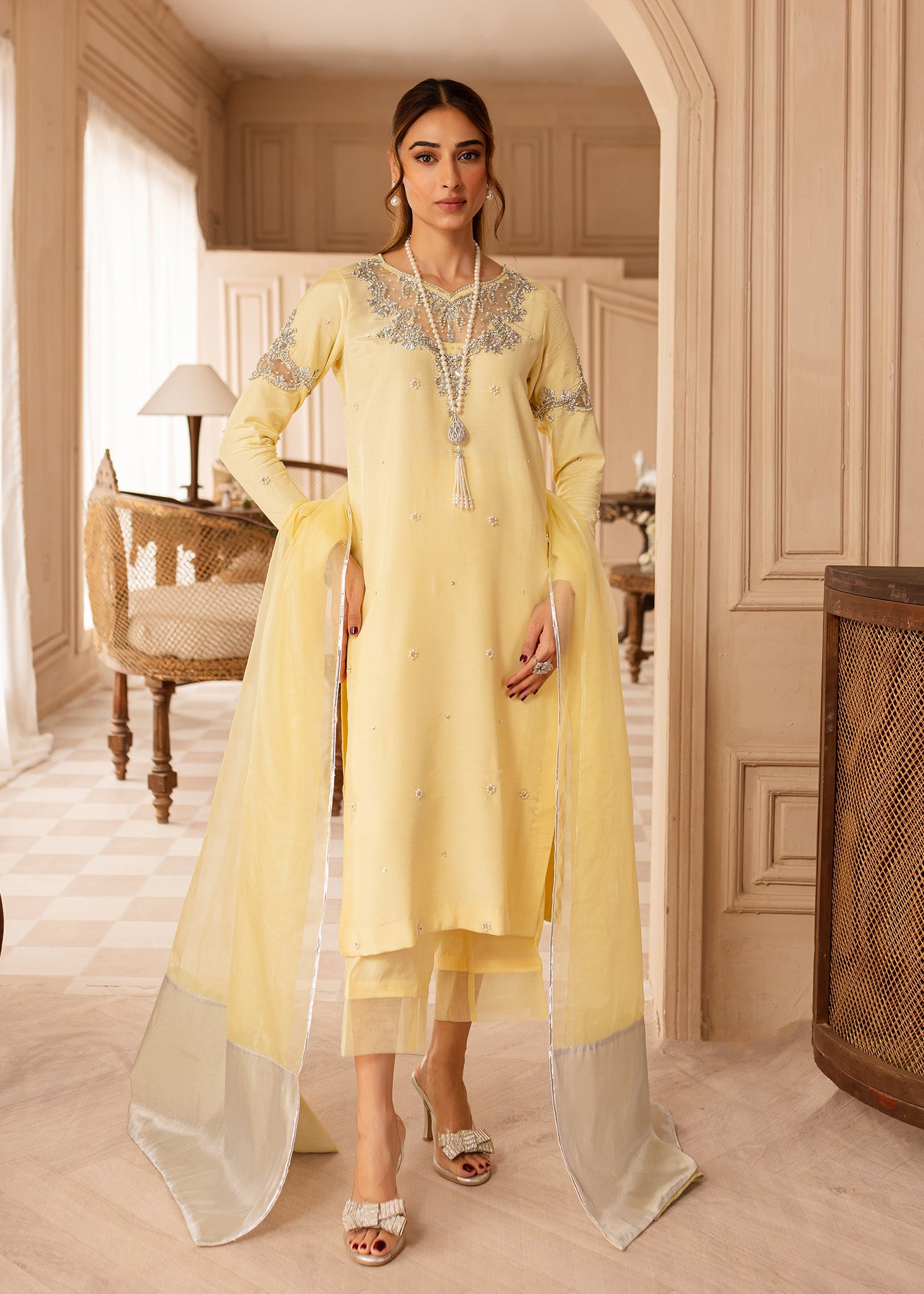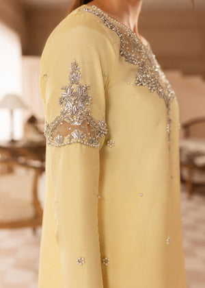 Discover the Faha dress in soft Lemon, put together with silver embellishments to form a beautiful Festive chic look, finished with handpicked precious stones, pearls and dabka. Paired with straight pants with organza borders. Sheer dupatta with silver borders. This ensemble epitomises sheer luxury.