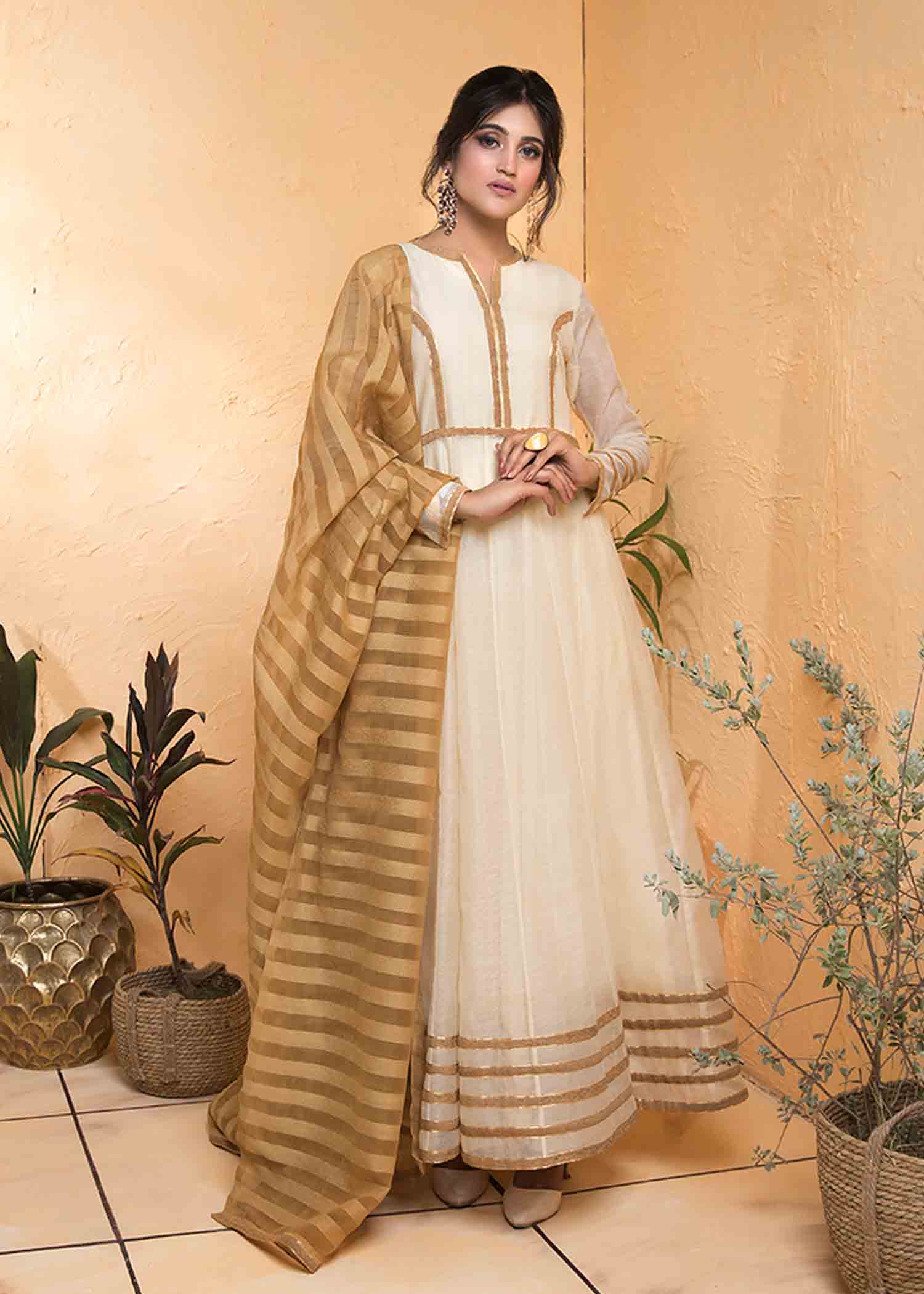 Description: An ethereal pearl off white ensenbale to reflect the summer sun. Made with crisp karandi net designed with well crafted techniques. This peshwas is embelished with horizontal gold running laces with beautifully created neck line paird with gold organza dupatta for chic look. Best suited for evening dinners.