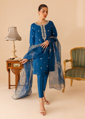 Celebrate festivities in style with this showstopper, Falak. This silk set is graced with embellished neckline and sleeves in the shades of silver and gold. Paired with straight pants and sheer block printed dupatta. Allow yourself to be enfolded in the embrace of timeless elegance and serene refinement.