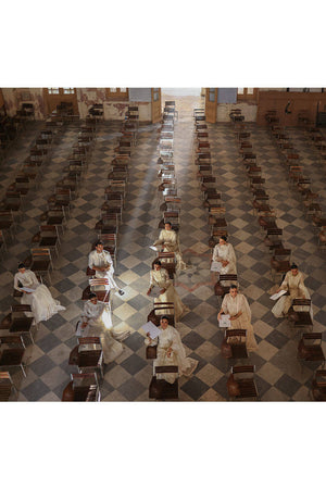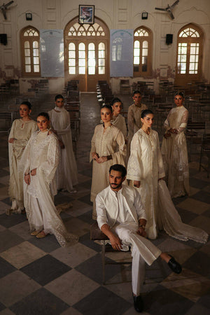 A short shirt with a striking, woven cotton neckline punctuated by dori tassels brings a hint of playfulness to tradition. The shirt's hem is adorned with floral patchwork framed in scalloped borders and decorative white trims, while the sleeves feature organza panels in a drop-shaped ogee pattern. Boring eyelet embroidery details and touches of adda work provide surface richness. Paired with an Egyptian cotton shalwar, which is finished with matching organza details, and a chiffon dupatta embossed with printed panels at each end and adorned with trims throughout, this Eid ensemble finds joy in detail and drama in silhouette.
