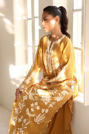 Draped in a standout butterscotch hue, a khaddi corduroy kaftan inspired shirt is exquisitely embroidered with aari featuring ivory botanical imagery reminiscent of artisanal filigree. Paired with matching pure rawsilk culottes with pleated details, the flowing silhouette exudes effortless sophistication.