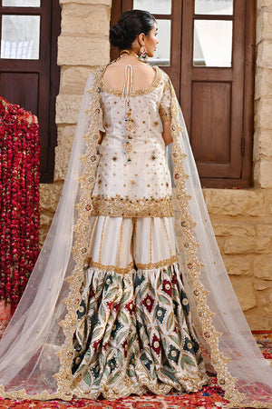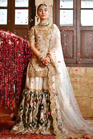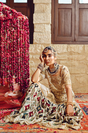 An ivory nikkah bridal that exudes timeless grace. The stiff net kurta, lined with sheesha silk, features Indian sleeves and a wide round neckline, detailed with gold handwork of dabka, nakshi, sitara, pearls, and resham. Paired with a sheesha silk gharara showcasing a Mughal-inspired appliqué jaal in maroon, green, and sage, highlighted with gota and sitara. The cutwork hem shimmers with pearls, dabka, and tiki stones, while the stiff net dupatta with cutwork borders and hints of colored appliqué completes this regal look.