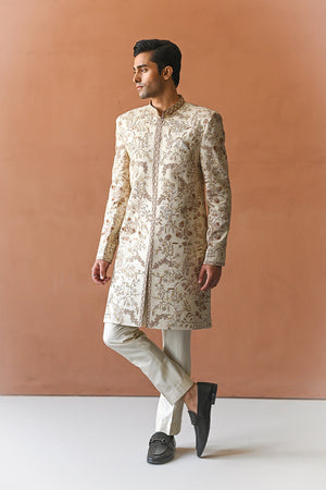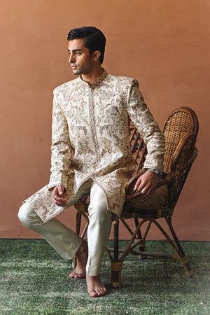 A regal ivory hued sherwani, cut from pure rawsilk, is an artisanal delight with hand embroidered aari details adorning the entire canvas. Lined with the finest medium silk featuring our quintessential print. Paired with matching pure rawsilk trousers and our signature printed pocket square.