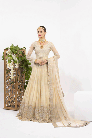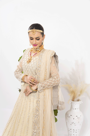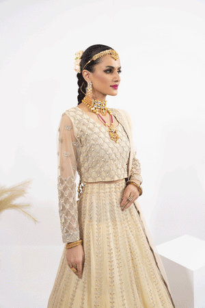 The lhnga choli exudes sophistication with its elegant color palette of skin accentuated by intricate resham and chandi tilla embroidery work. The crisscross spiral designs, adorned with cora embellishments, add a touch of opulence to the ensemble. The lhnga border further enhances the overall aesthetic, creating a visually striking and heavier look. The accompanying dupatta beautifully complements the dress, elevating its overall appeal and completing the sophisticated ensemble.