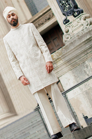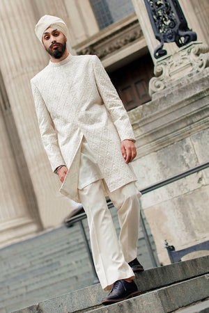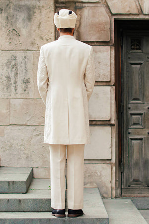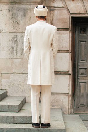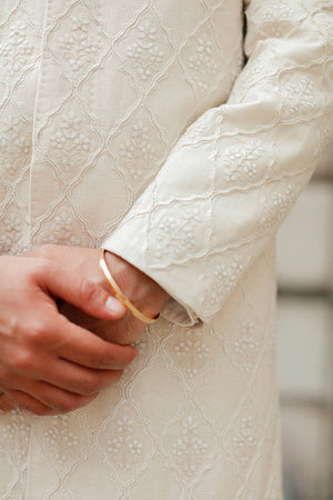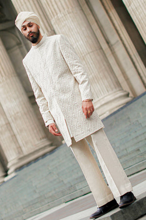 Introducing Fateh — a timeless white sherwani in pure karandi fabric, embellished with intricate chord embroidery and delicate tread work depicting beautiful Mughal jaali in tonal shades. Layered over a plain karandi inner kurta and wide trousers, this ensemble embodies understated sartorial elegance.