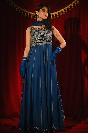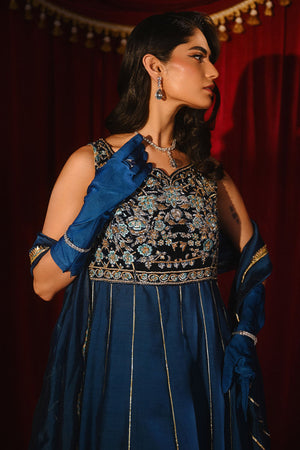 This sleeveless kaftan-style kalidaar features a richly hand-embroidered velvet bodice that exudes timeless elegance. The luxurious texture of the velvet contrasts beautifully with the flowing medium silk dupatta, creating a harmonious balance of structure and softness. Refined craftsmanship and graceful detailing make this ensemble a statement of understated sophistication.