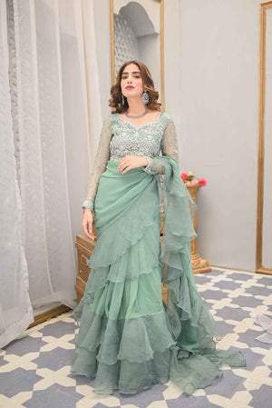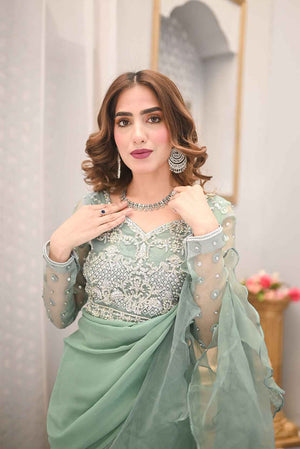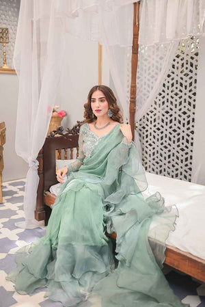 6 yards of pure elegance and glamour - Turn heads in this statement formal, a fully hand encrusted blouse with voluminous ruffled mint green chiffon saree. Style this gorgeous saree with a pair of embellished stilettos