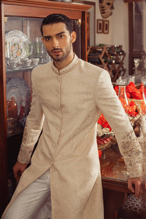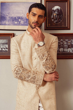 Signature MNR "Feroze" ensemble features a sherwani, draped in a mesmerizing beige gold hue, is crafted from decadent self karandi fabric, adorned with intricate Mughal patterns. Its allure extends to the rich jacquard pattern that adorns the fabric, a nod to timeless craftsmanship. However, what truly captivates is the gilded work across the sleeves, a showcase of traditional Mughal motifs. Here, a bouquet of resplendent flowers in various tones of gold emerges, bestowing an opulent richness to this ensemble that is nothing short of regal.