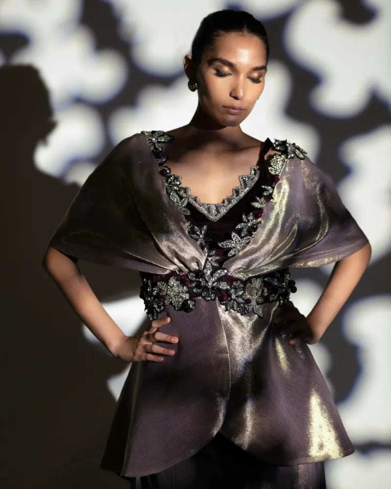 Detailings: Swarovski Crystal Ornamented Floral 3D Embroideries Cladded Peplum Top