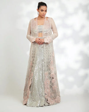 Detailings: Adorned with Fine Cutwork Embroideries & Delicate Handcrafted 3D Floral Patterns All Over the Front & Along the Hemline. This Glamorous Piece is Jewelled with Silver Crystals and Zardoze Handwork.