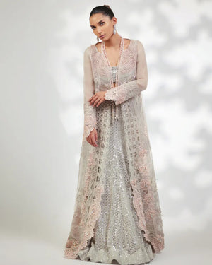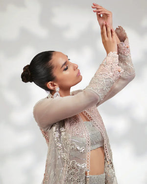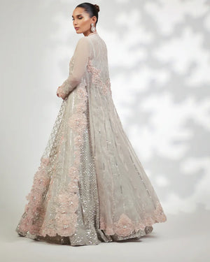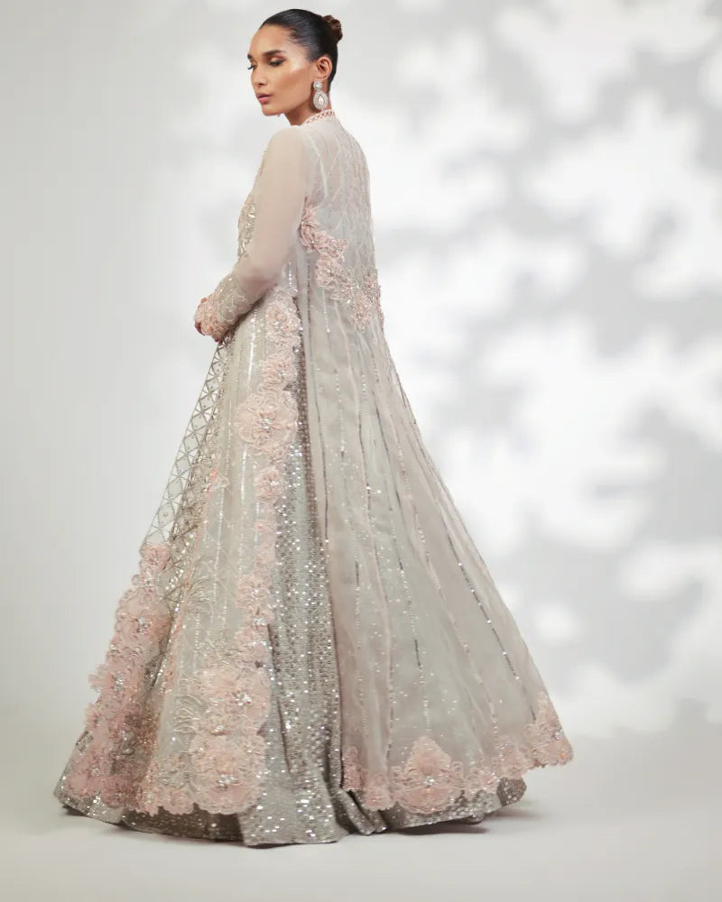 Detailings: Adorned with Fine Cutwork Embroideries & Delicate Handcrafted 3D Floral Patterns All Over the Front & Along the Hemline. This Glamorous Piece is Jewelled with Silver Crystals and Zardoze Handwork.