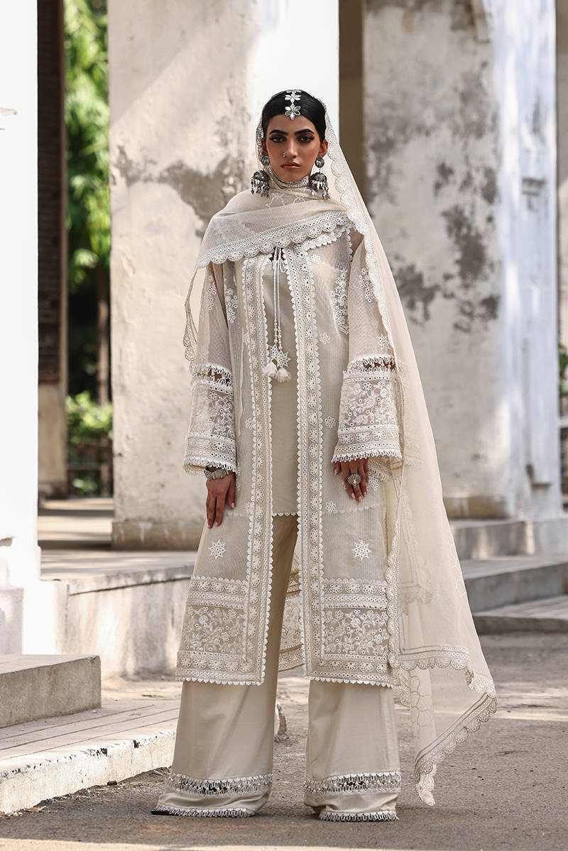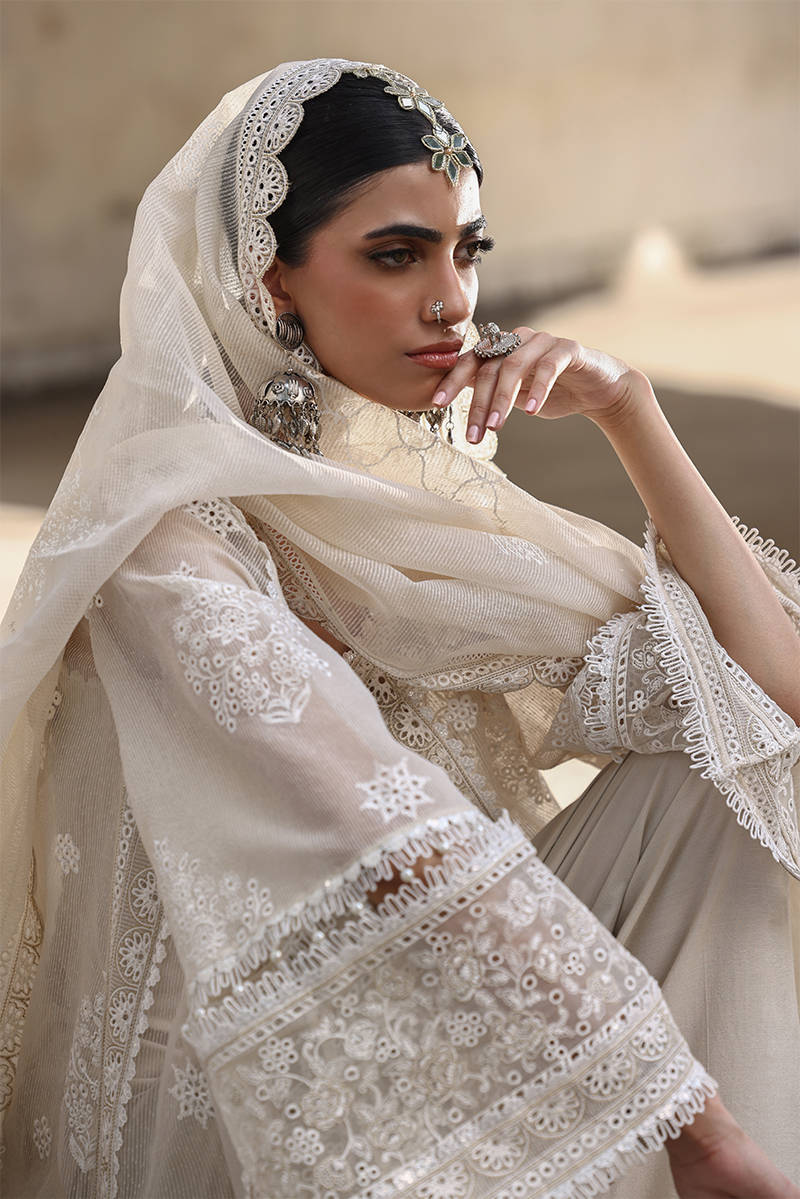 This open-front shirt in kulla karandi is designed to float over a cotton net slip, its sheerness offset by floral boring embroidery and scalloped edges done in decorative trims. The play of shadow and structure is balanced by wide-legged trousers with beautiful trims at the hem and delicately hand-embellished with pearls. The dupatta in matching kulla karandi is block-printed with three separate motifs, each framed by scalloped embroidery and finished with multi-head embroidery. It makes for an Eid ensemble that reads like poetry in texture.
