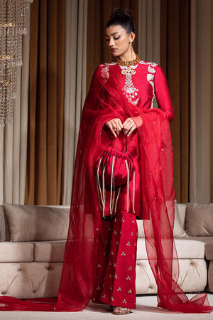 Fire of Love features a mid length tissue silk shirt in classic red with beautifully embroidered neckline in white. The embroidery is aesthetically hand embellished with dabka and crystal details. It is paired with tailored bootcut pant with sequins boti spray on it in red. You may add sequined organza dupatta and designers special rounded bag to complete your look.