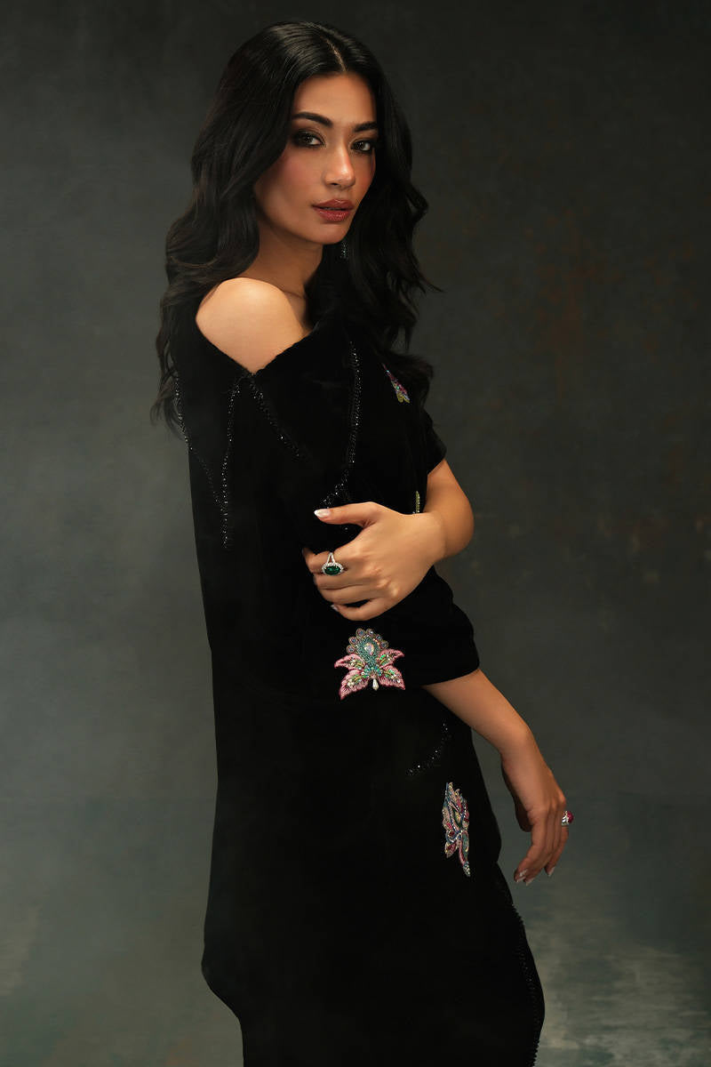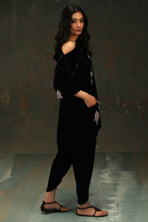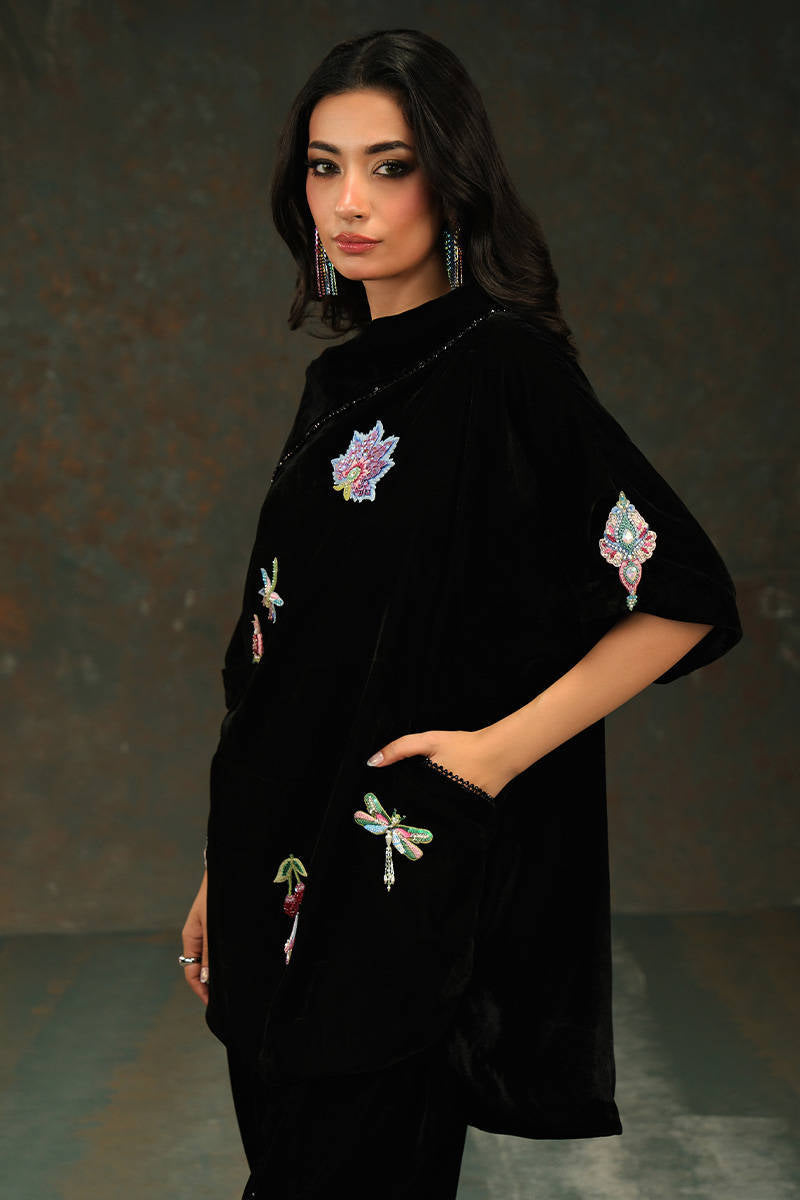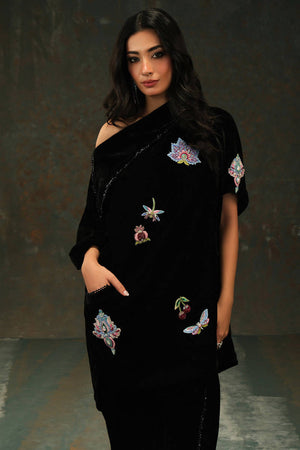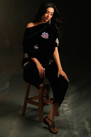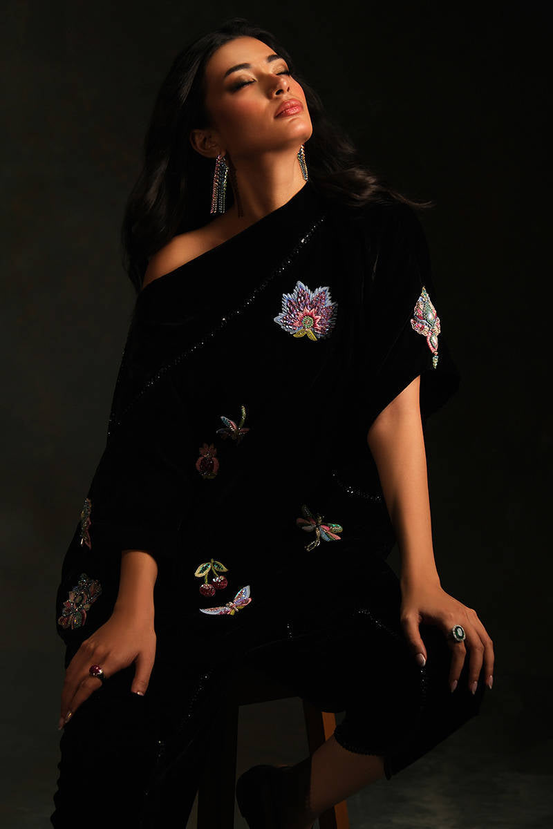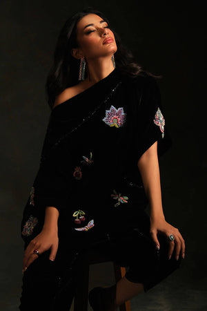 This off-shoulder velvet top features whimsical hand-embroidered motifs inspired by jeweled brooches. A crystal-lined structured neckline and pockets elevate the relaxed yet refined silhouette. Paired with our crystal-detailed velvet tulip shalwar, this looks channels effortless glamour with a fun, fashion-forward twist. The collar can be worn in a regular/non-off shoulder way as well