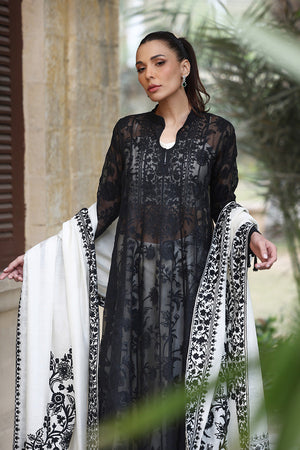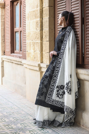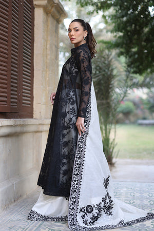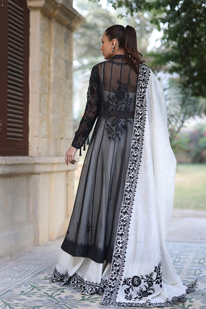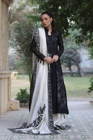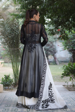 An elegant ebony hued kalidaar peshwas is cut from organza and adorned with intricate tonal aari embroidery. Paired with a voluminous pearl toned khaddi silk dhaka pajama featuring striking aari embellished borders and a matching tube top with aari work. The monochromatic ensemble is elevated with a cascading pearl khaddi silk dupatta with detailed aari borders and floral bouquets decorating the pallu in an ebony hue.