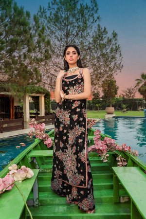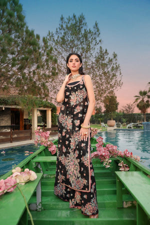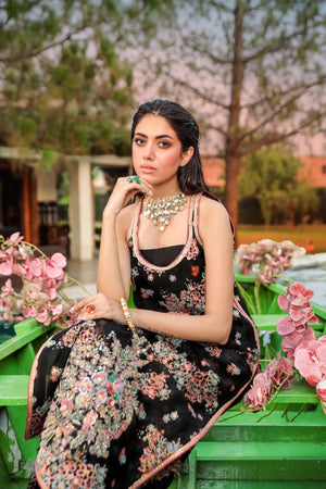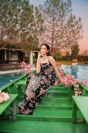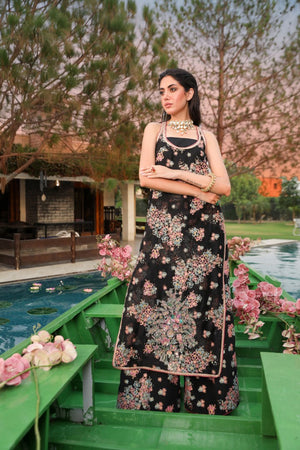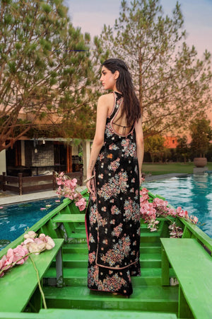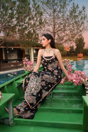 An eyeful black screen printed long shirt with a halter neckline finished with heavily embroidered and hand embellished floral bunch on the hem. Paired with printed plazo pants.