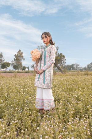 A white raw silk screen printed short shirt with hand embellished neck hem motifs, paired with raw silk printed culottes pants.