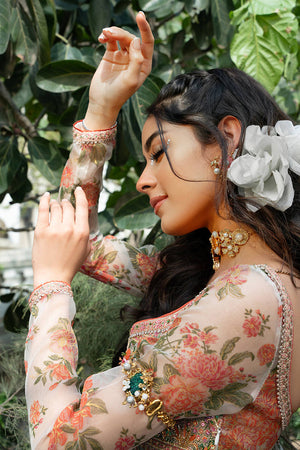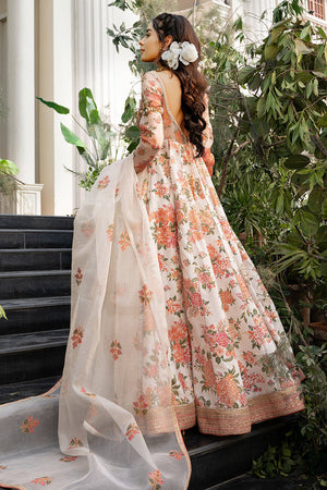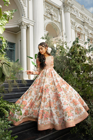 An ivory raw silk screen printed kalidar with heavy embellished bodice, embroidered hem borders and fitted sleeves. Completed with block printed organza dupatta, paired with plain raw silk choridar.
