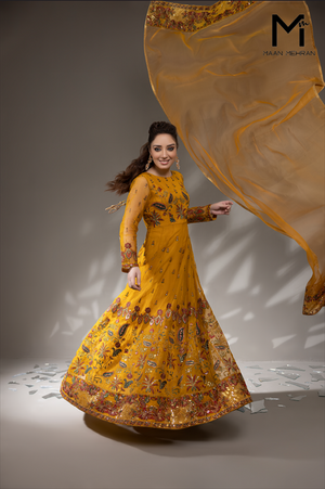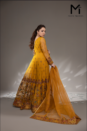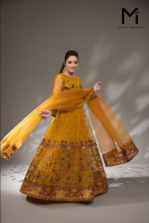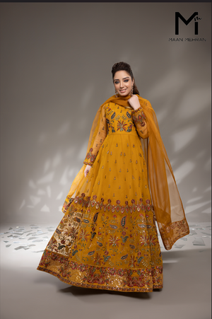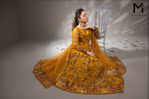 This exquisite Mustard coloured peshwas is heavily embroided and embellished with resham, tilla, and sequins in the front and on all the panels. Its paired with mustard US pants and a charming mustard dupatta that has two sided borders. A great dress can make you remembered what is beautiful about life.