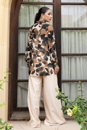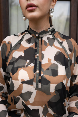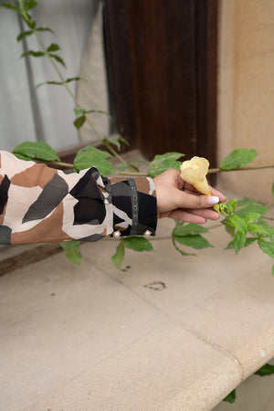 Freya is the epitome of effortless sophistication. This striking co-ord set, crafted from naturally airy chiffon, features a bold abstract print that echoes coastal cool. With lace detailing on the shoulders and front, elegant pearl buttons, and wide raglan sleeves, Freya exudes confidence and style.